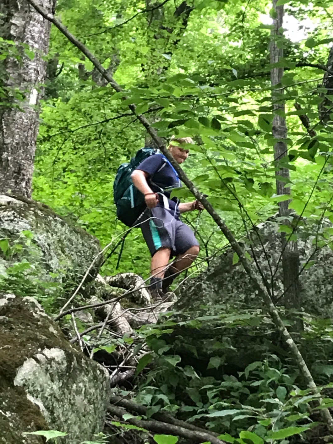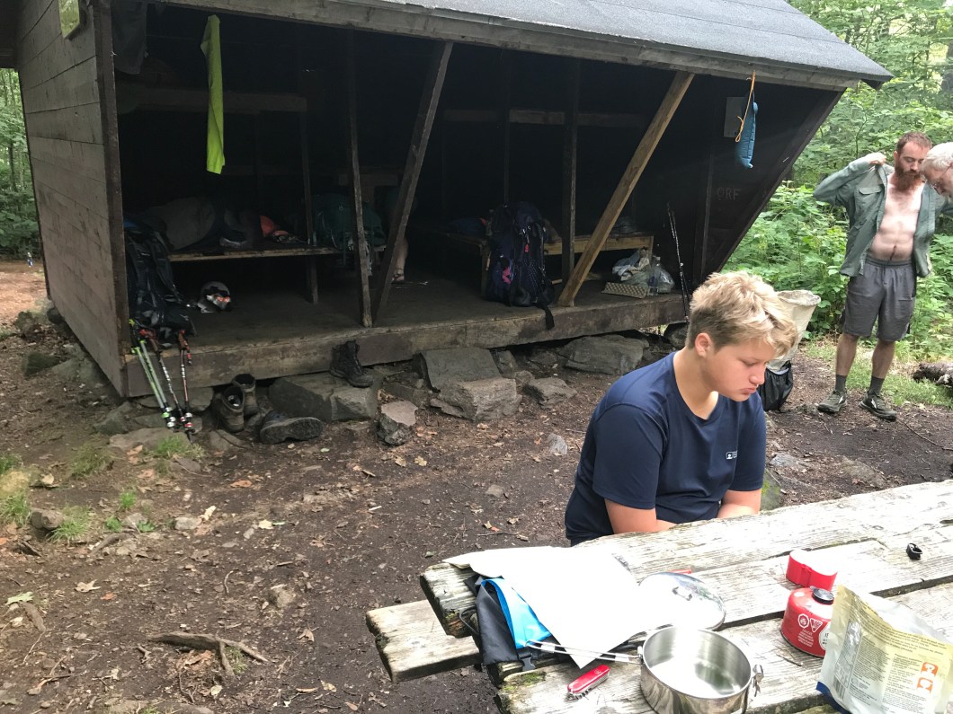 Our first sorta serious day. Started at 8:30 – last to break camp. We will get better at that as we go along. Just a matter of dividing labor and getting more efficient. You have to stuff sleeping bag, air mattress and pillows back into their compression sacks, stuff ’em in your packs, break down cooking gear, clean that, pack it, decide what to wear (or keep on what you got!), and that’s if you slept in the shelter. If a tent, break that down and pack the fly and ground tarp as well. And you need water on the trail, and it all has to be filtered. We have a 6 liter bag that filters by gravity, and we drip it into 3 liter bladders that go into our packs and have a hose that we can suck on as we hike. The thru hikers don’t like carrying all that. That have a more nimble setup. All mundane stuff, but the better you get, the earlier you go and farther you hike.
