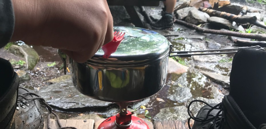 Day 3 we fell 5 miles short of our goal, owing to withdrawals made by the energy gods the day before. In our defense, Goddard was a pristine shelter, clean and new and with a big deck to cook on. Plus the sun was out and we still had the summit of Glastenbury to get over. We were beat, and called it quits. We tried the solar charger but it needs direct sunlight and progresses pretty slowly. The idea of strapping it to the top of Cliff’s pack so it could charge while we walked was a silly dream: we are under forest canopy 95% of the time so even sunny days don’t help. We had chicken and mashed potatoes. That’s Cliff with freeze dried chicken breasts. They look like about what you’d figure, no?