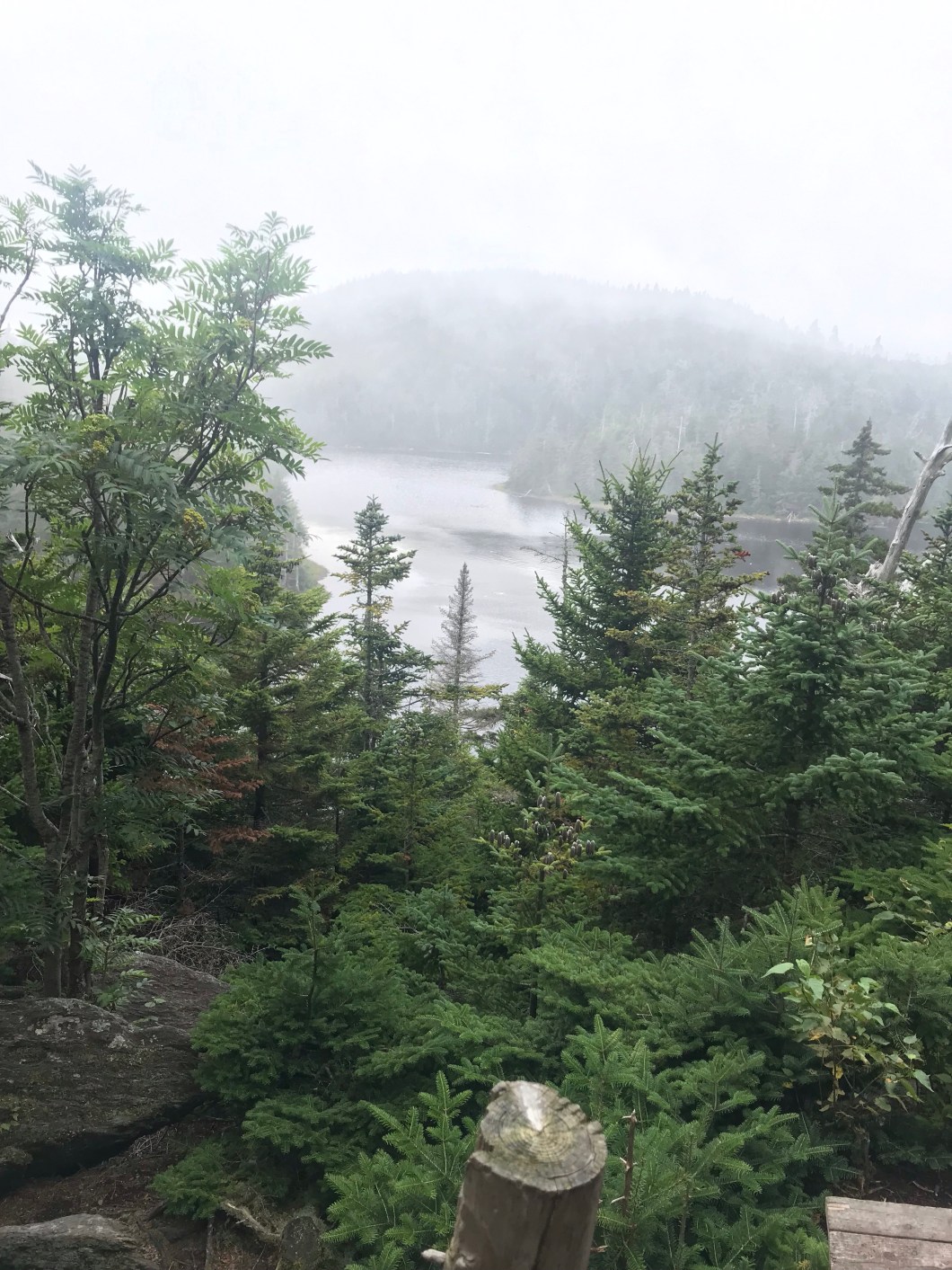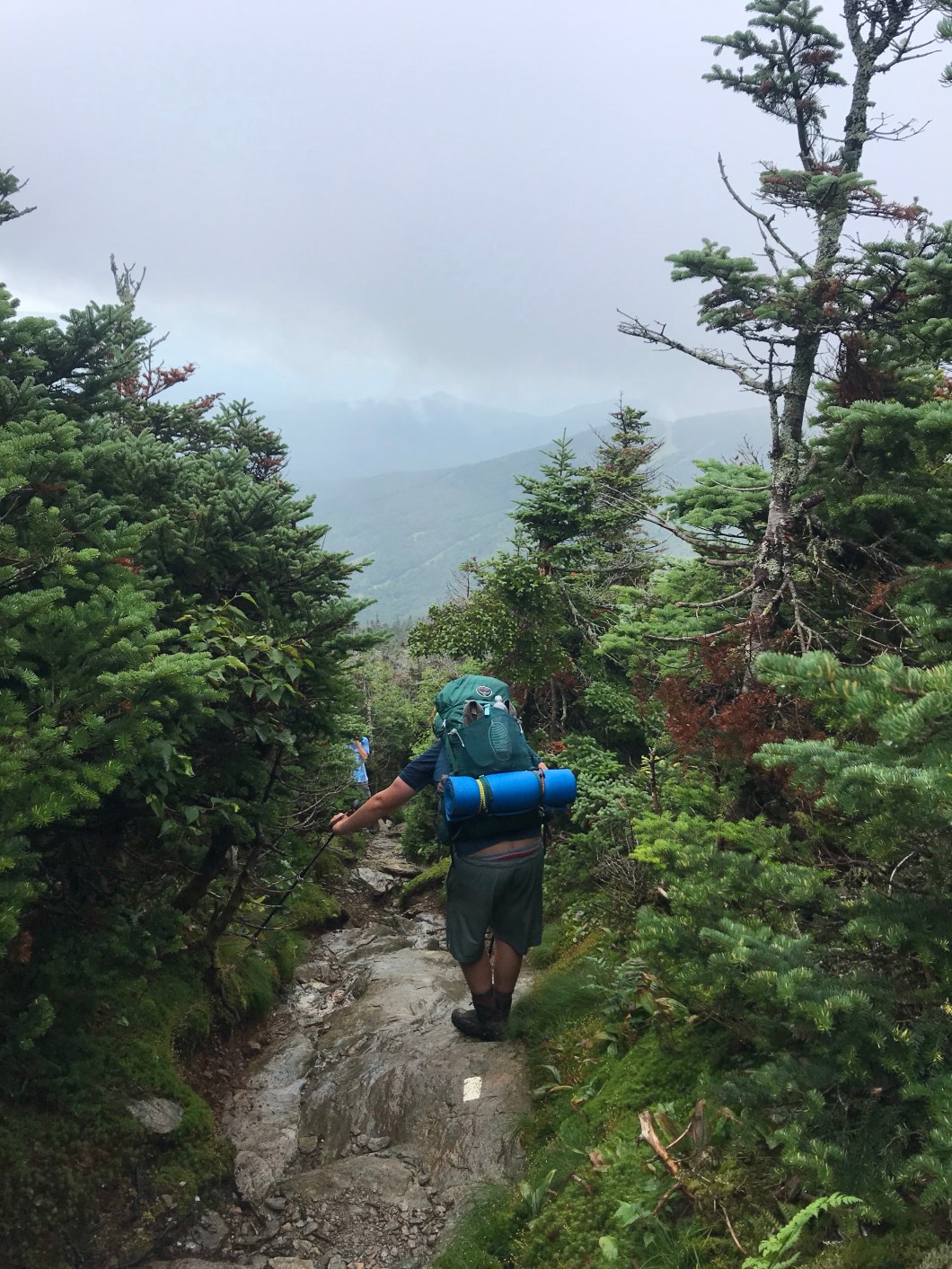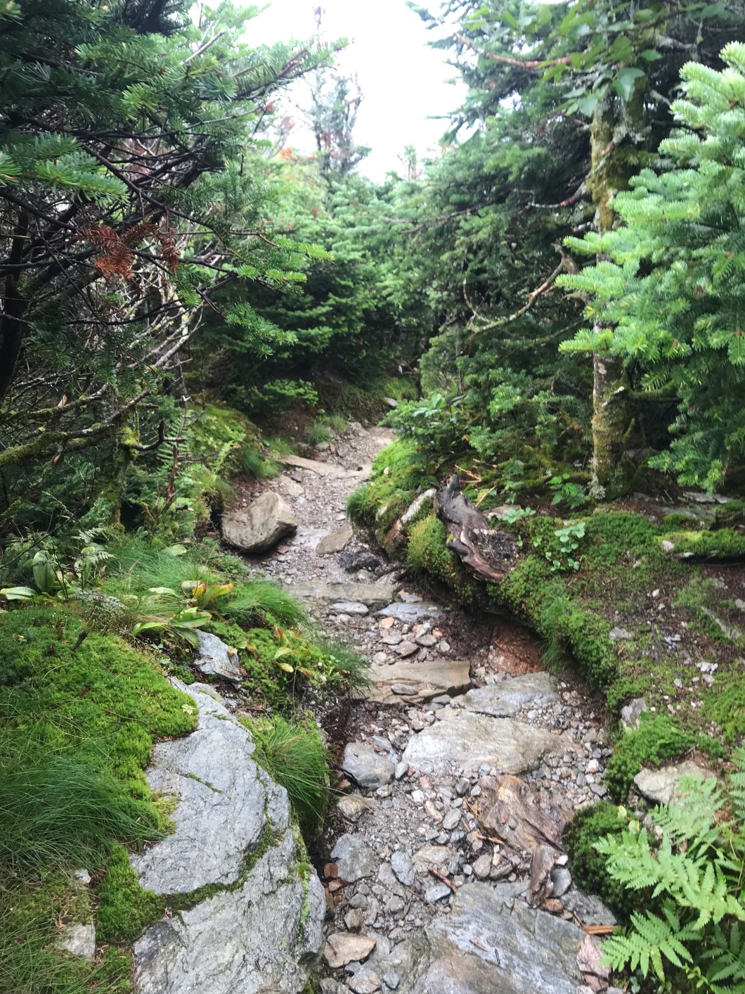 Where I’m going with this is that things would have been different if we had started, like last year, in S VT – it’s a lot mellower and you can break the body in and prep it for the tough stuff further north. On Thursday, August 22nd, we started with what might be the toughest descent on the entire trail – off of the Chin and down to the bottom of Smugglers Notch. As all hikers know, descending steep rock ledges is much trickier than ascending, and we were doing it with full packs in fog, which, combined with the recent rain, made it slippery. We picked our way down deliberately, and when we got to the road, ready to ascend the north side of the Notch, it was already 3:00, and our knees, feet, and quads were toast. I’ll cut the whining short by saying we arrived at Sterling Pond, our first overnight, at 7:00, with sun already behind the ridge. That’s 3 miles in a bit less than 4 hours. That’s 7 miles on Day 1, with 5 days remaining to go 67 miles. As we wedged our cramping frames into our bags, we told ourselves we’d done the gnarliest bit, and we’d hit it fresh in the morning.