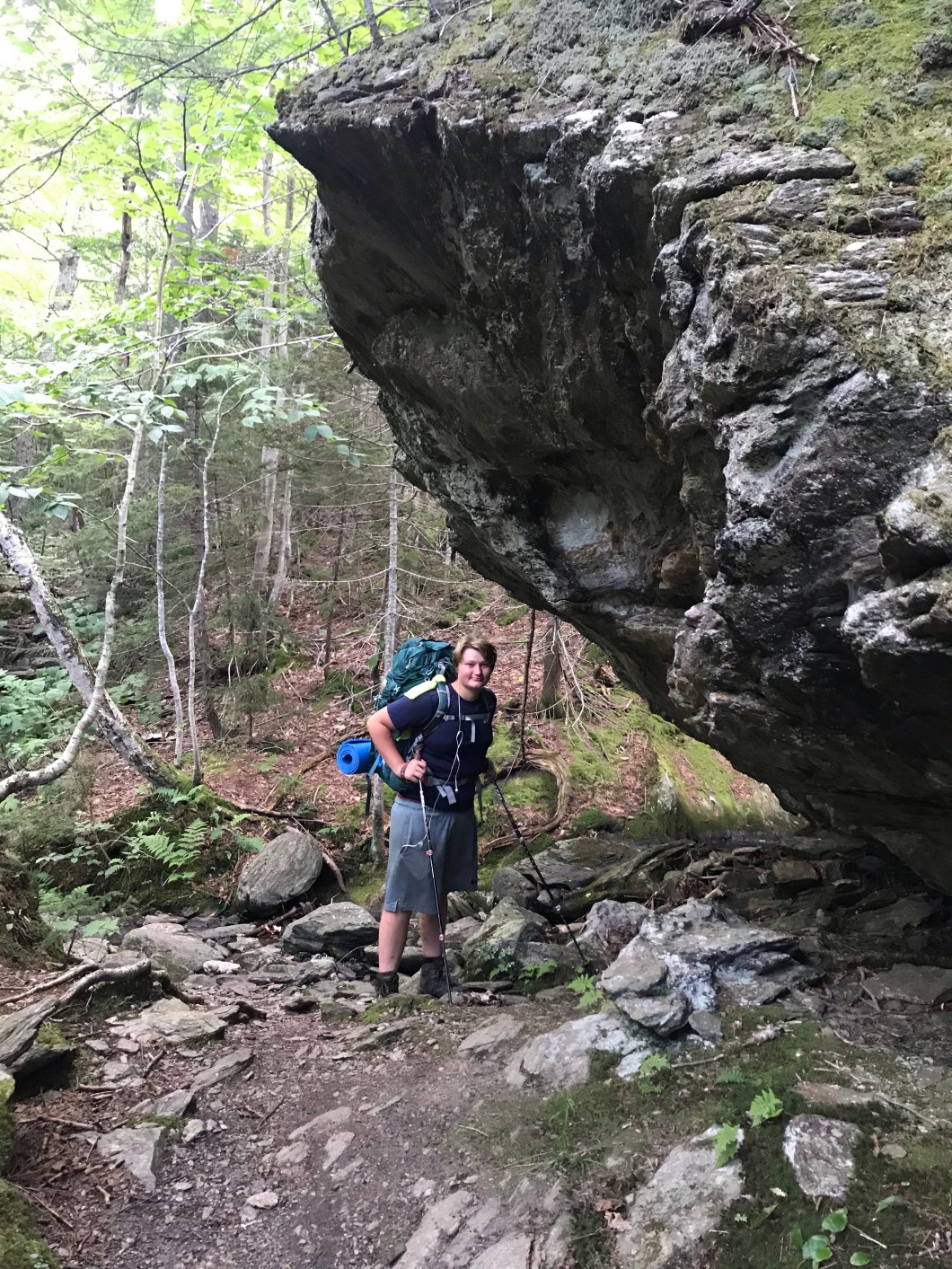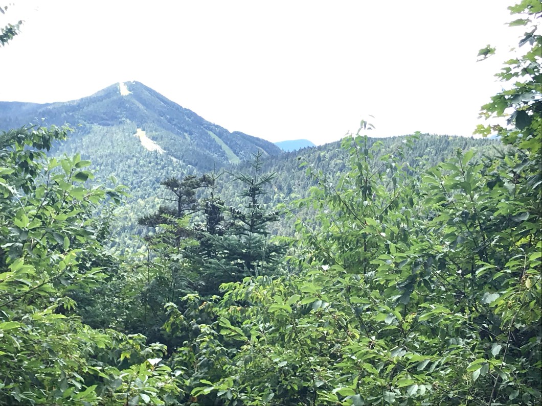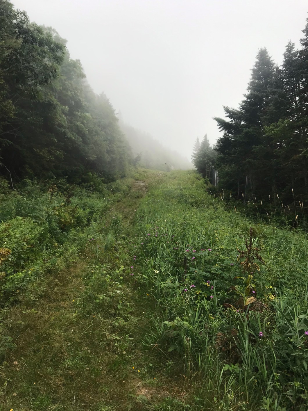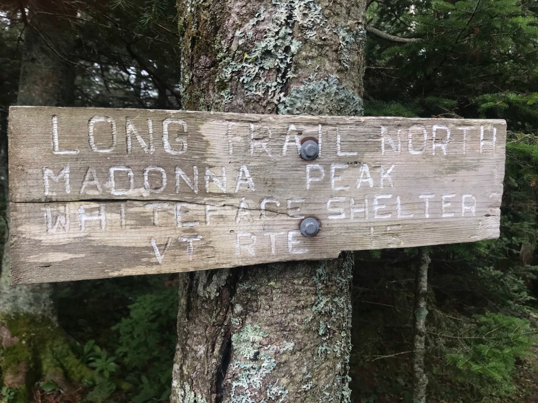 Back to the hike. I didn’t set an alarm cuz I figured I wouldn’t sleep well the first night in a bag in a while, BUT… woke up a bit before 8 and we didn’t get going until about 9:30. First thing on tap was a 700 ft climb up Madonna. Most of it was one of those ascents that has the trail cut into the side of the mountain – steep up on the right, and down on the left -so youŕe hiking with gravity pulling you left and down. Itś a test for the left pinky toe for one thing, and for your left ankle if, letś say, you ripped the ligaments in it a year ago. (Poor poor pitiful me :). Ski trails took us the final 200 feet and we arrived at a summit that was still partially fogged in, but cleared up nicely as we hemmed and hawed at the top. Steep, winding descent off of Madonna, then an abrupt 500 feet to an unnamed dome, followed by another 600 feet to the summit of Whiteface at 3,700 ft. We stopped for a bit at Whiteface Shelter where we met a young man on his second of two gap years (heh heh) – the first human we’d seen since leaving Sterling.The descent from Whiteface to Rt 15 in Johnson, at 3,100 ft, is one of the longest on the LT, and by the time we neared the bottom, we knew we were not going to make Roundtop Shelter, our goal, which was another 4 miles and about 1,200 ft up from the road.