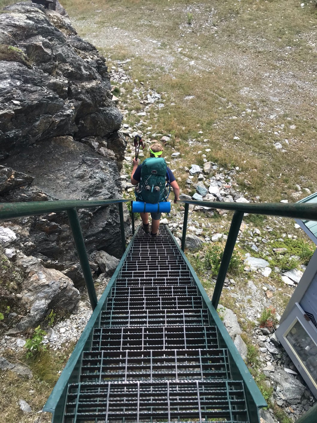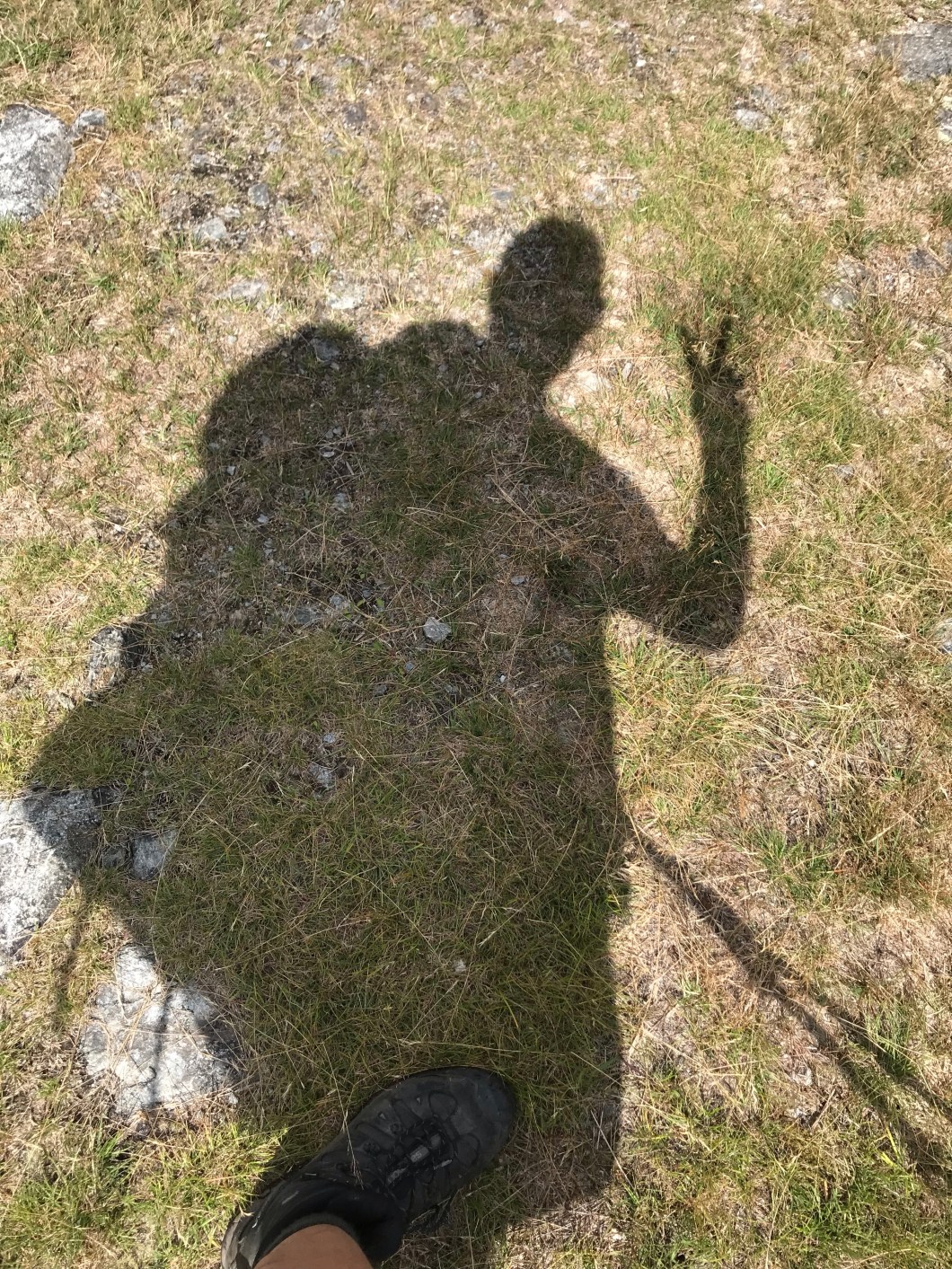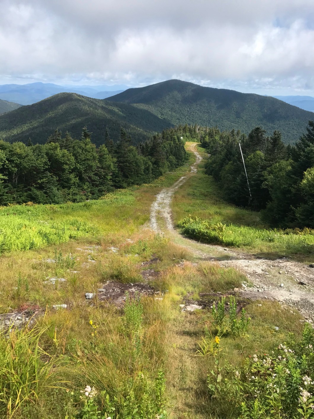 Back to the hike. I didn’t set an alarm cuz I figured I wouldn’t sleep well the first night in a bag in a while, BUT… woke up a bit before 8 and we didn’t get going until about 9:30. First thing on tap was a 700 ft climb up Madonna. Most of it was one of those ascents that has the trail cut into the side of the mountain – steep up on the right, and down on the left -so youŕe hiking with gravity pulling you left and down. Itś a test for the left pinky toe for one thing, and for your left ankle if, letś say, you ripped the ligaments in it a year ago. (Poor poor pitiful me :). Ski trails took us the final 200 feet and we arrived at a summit that was still partially fogged in, but cleared up nicely as we hemmed and hawed at the top. Steep, winding descent off of Madonna, then an abrupt 500 feet to an unnamed dome, followed by another 600 feet to the summit of Whiteface at 3,700 ft. We stopped for a bit at Whiteface Shelter where we met a young man on his second of two gap years (heh heh) – the first human we’d seen since leaving Sterling.The descent from Whiteface to Rt 15 in Johnson, at 3,100 ft, is one of the longest on the LT, and by the time we neared the bottom, we knew we were not going to make Roundtop Shelter, our goal, which was another 4 miles and about 1,200 ft up from the road.