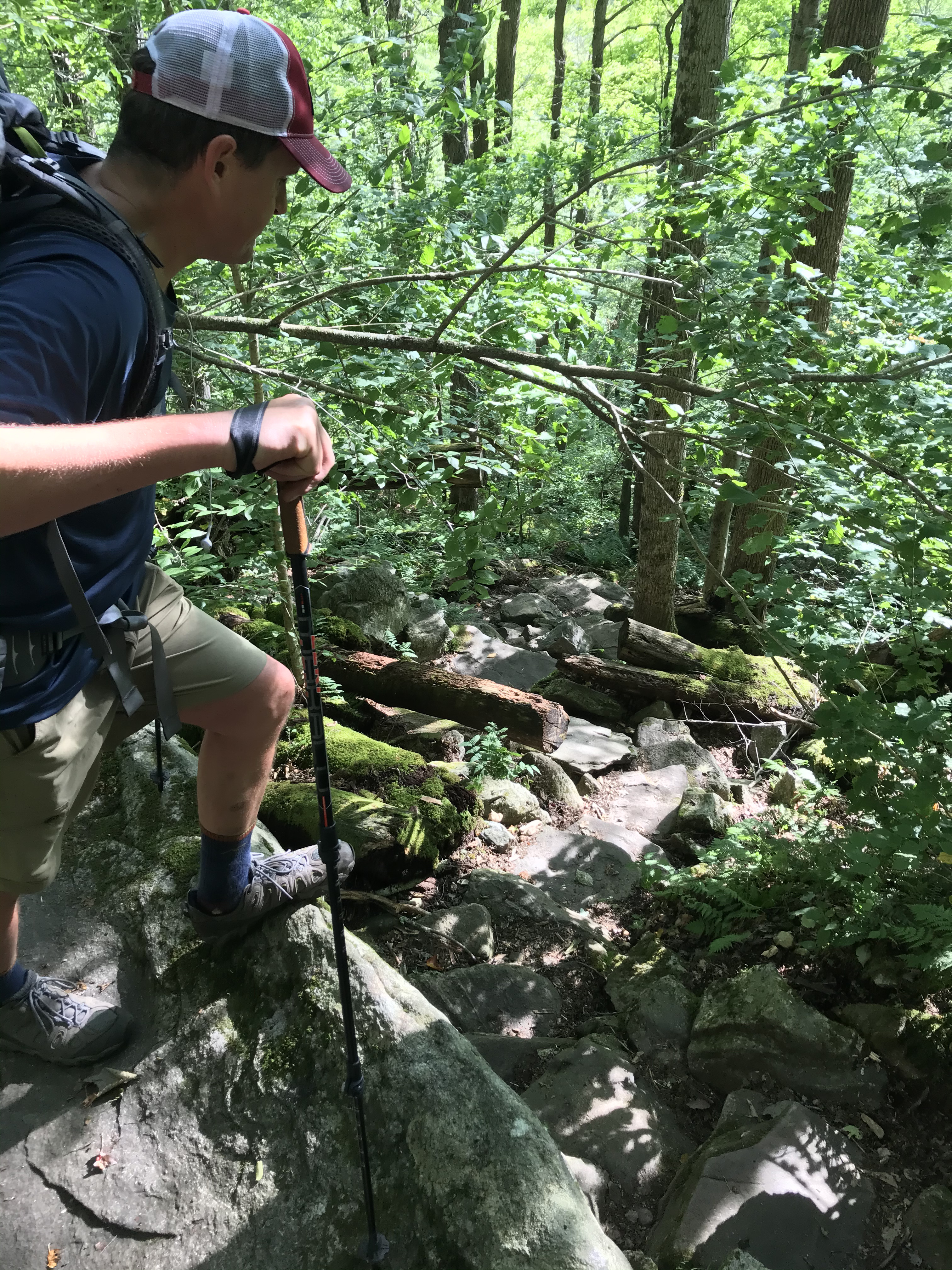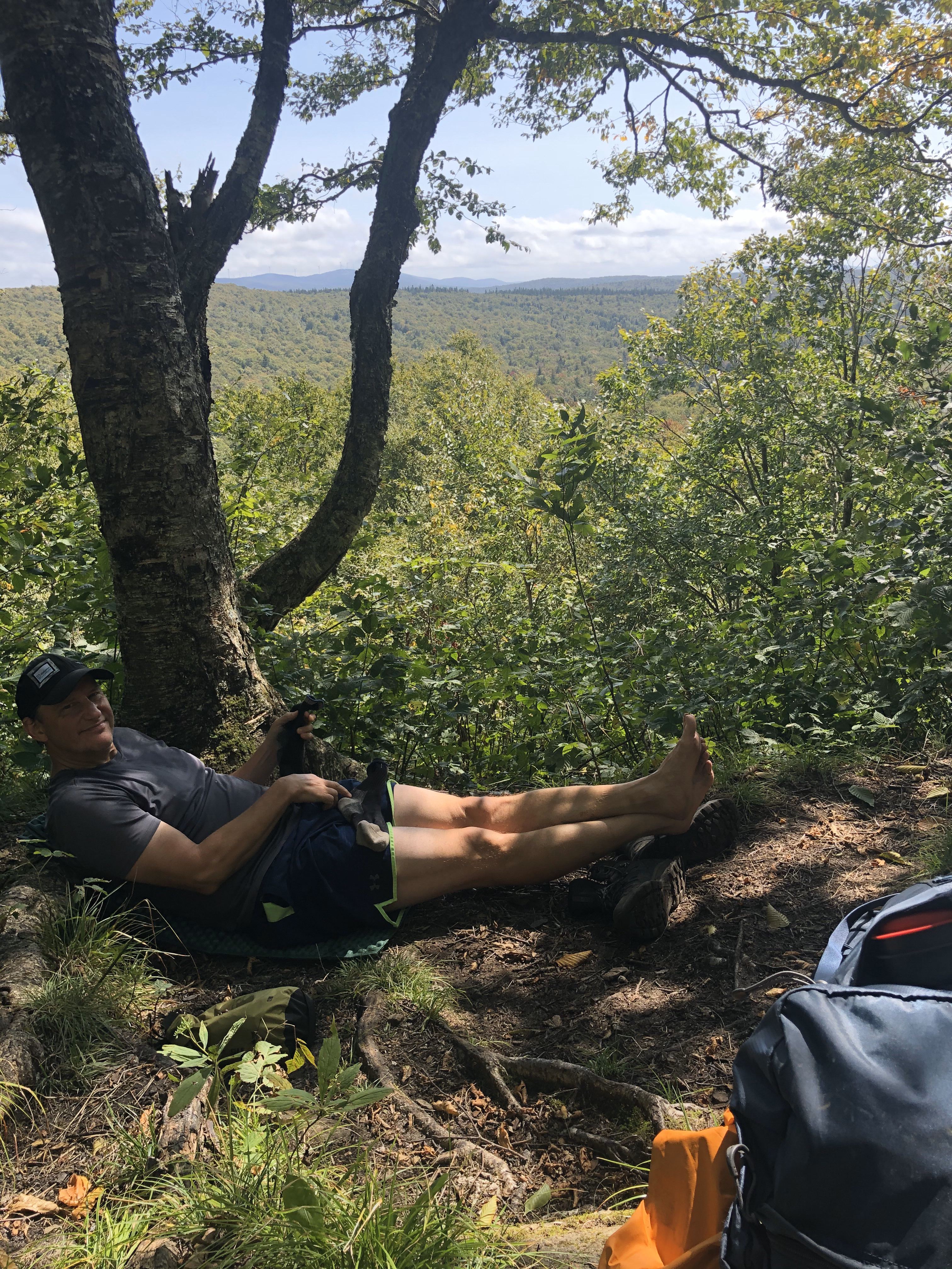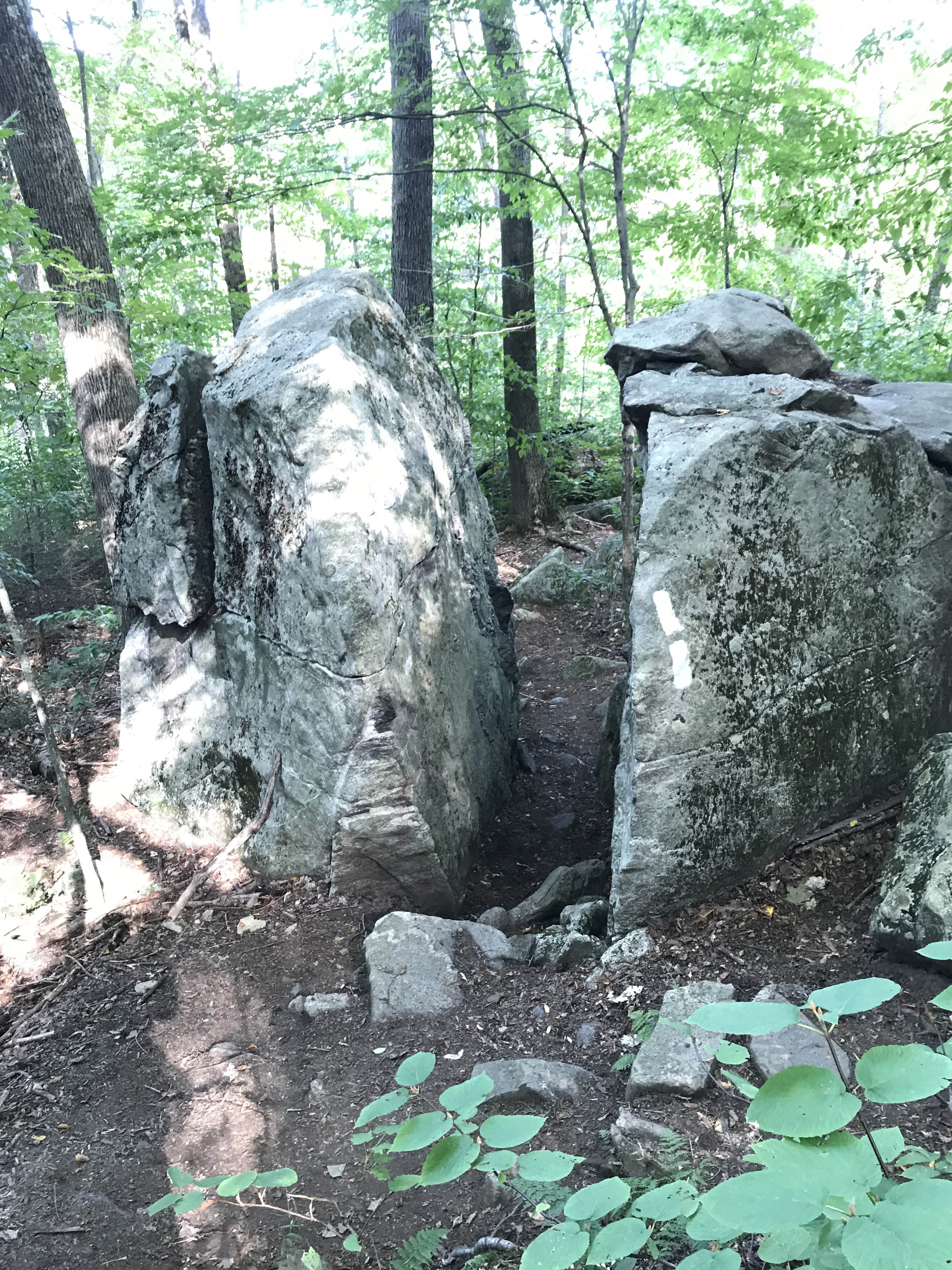 From there it’s a steep, stone stairway (sort of) down to Rt 9, which crosses the state from Bennington to Brattleboro, and up the other side to Melville Nauheim Shelter (hiking thru “Split Rock” on the way), on to Porcupine Lookout where we lunched, and up most of Glastenbury Mountain to Goddard Shelter.