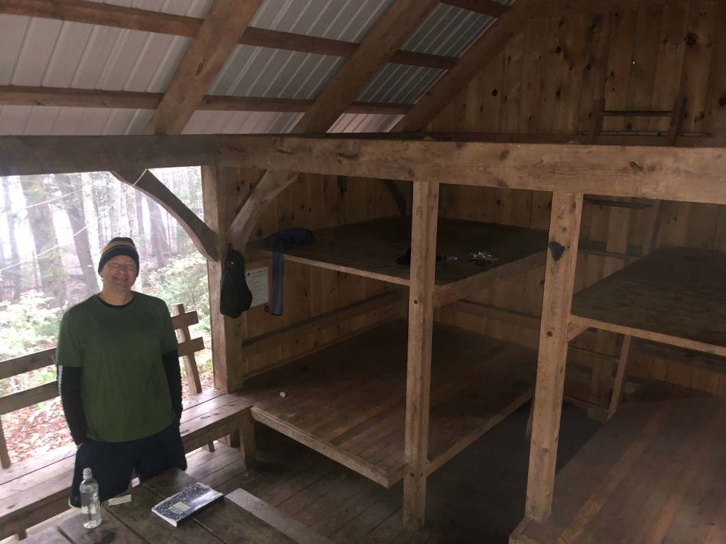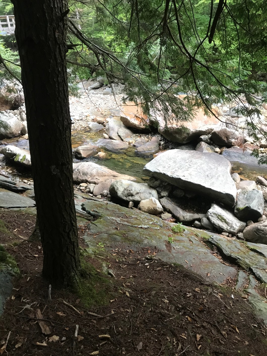 The hike then heads over Spruce Peak and down to Griffiths Lake, which has tent platforms and should have a caretaker, though we haven’t seen one yet, despite their tents still up. The only real vista is from Baker Peak, which you get to by climbing up the edges of flat sections of rock that look like they’ve been shoved diagonally into the mountain. From there we descended to the Big Branch River, one of those Vermont streams chocked full of SUV-sized boulders. The good news here is we were NOT stung by yellow jackets, as happened to both of us on the shakedown. The mild ascent up the road to Little Rock Pond takes about an hour, and 15 minutes in, it started raining and I’d forgotten my rain jacket at home. Never hiked so fast in my life, and totally lucked out as the rain stopped by the time we got going in the morning. Better to be lucky than good!