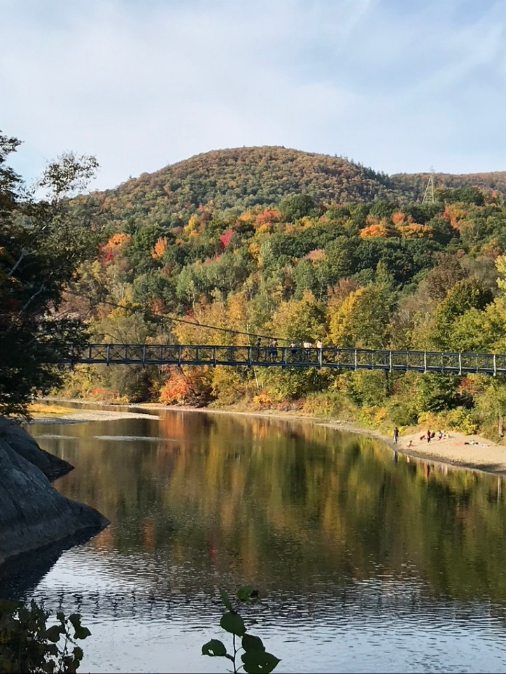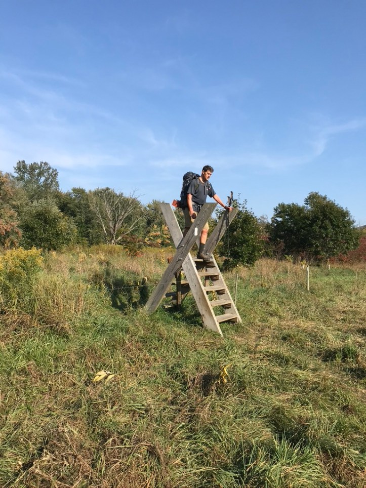 Weather on the big summits is always crap shoot, but today we rolled sevens – as soon as we started poking our heads above the trees, we knew we had a good one, as you can see in the pics. The caretaker was right: even at 9:30, there were already about 50 people on the summit, and more were snaking up the side trails like pilgrims. We spent about 45 minutes up there and started the long trek down. We lunched at the Bamforth Ridge shelter (where I have overnighted in thunder storms twice with family) and got down to the road. The distance from MG Lodge to Buchanan, is about 17 miles, which was too long for us today with the Hump in the middle, and Bamforth is only 5.4, so we toyed with the idea of staying in an establishment in Waterbury but decided that was too lame given we had spent only one night in the woods since Waitsfield. So we settled on the idea of stealthing it somewhere on the long approach to Bolton on the north side of the river. It’s a long, flat trek along the Duxbury Road and through farm fields in the valley – really not another place like it on the trail. Check out the kids jumping off the hiker bridge – and I didn’t think the water there was more than waist-deep, especially in a dry year like 2020. But they knew better!