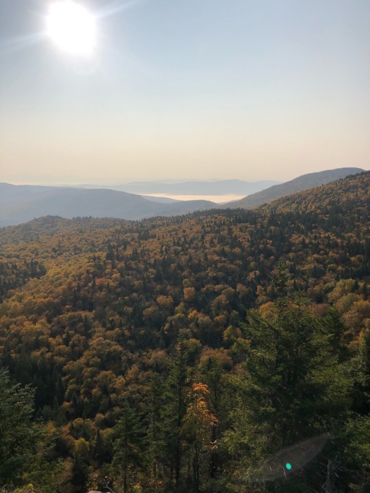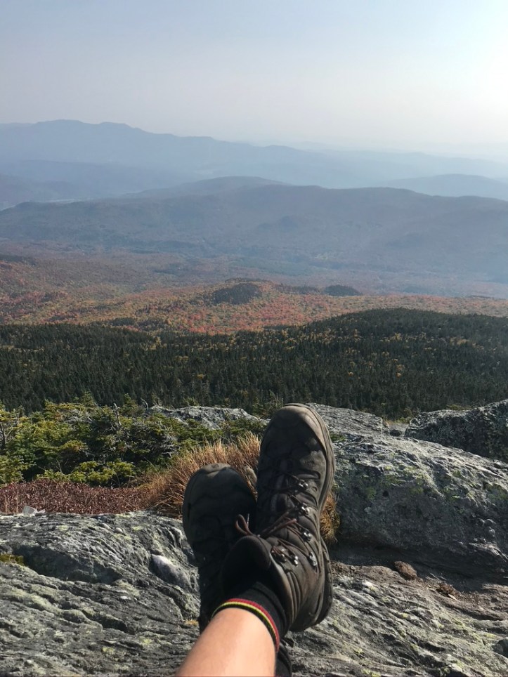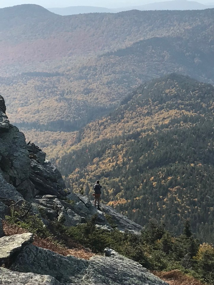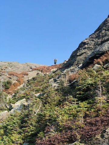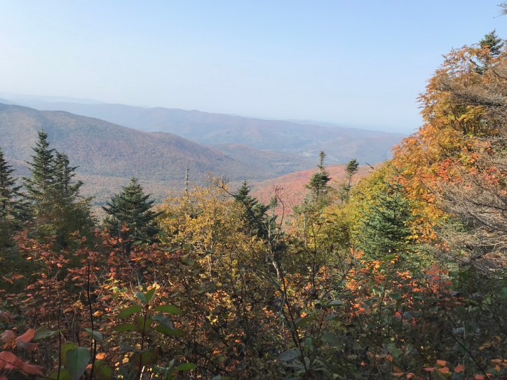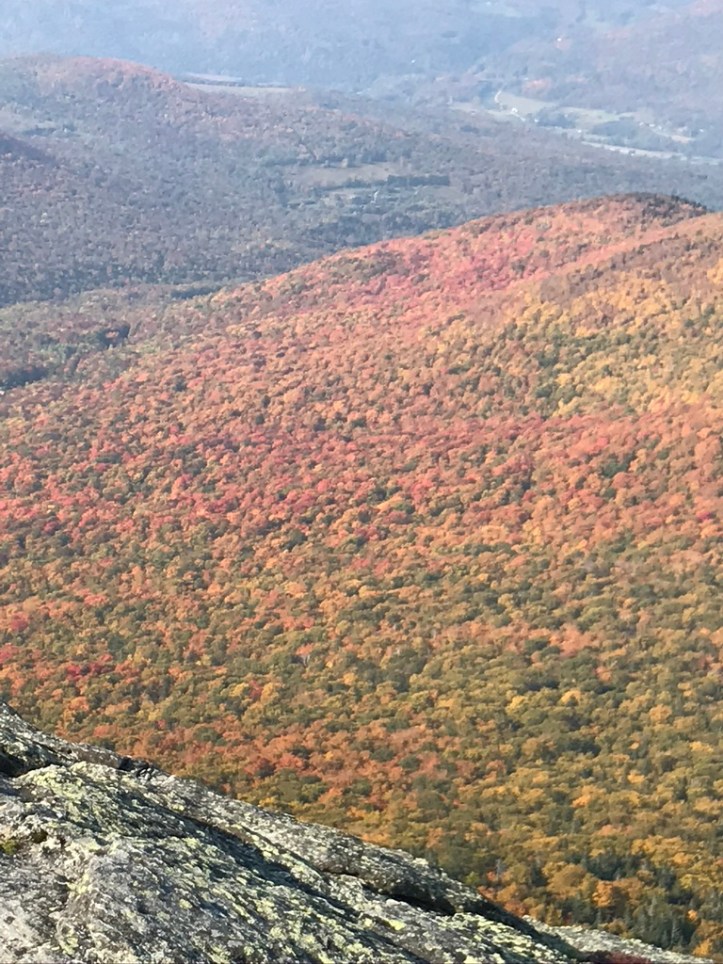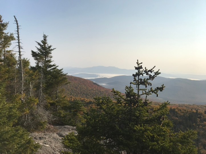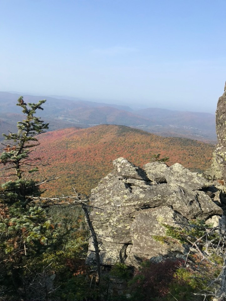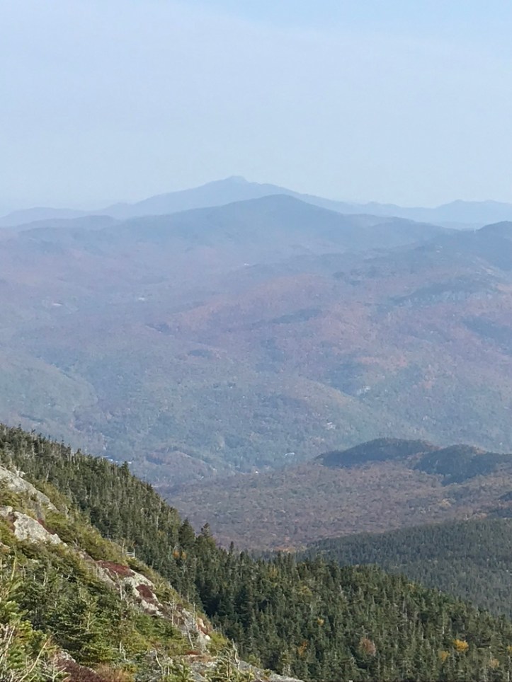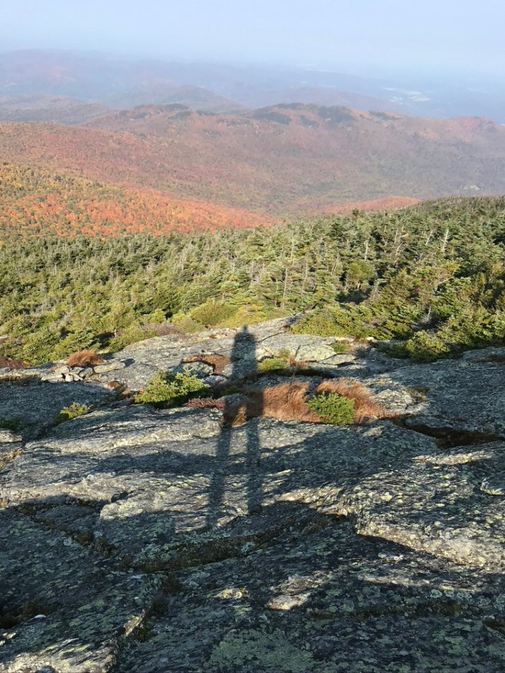 Today was Hump Day for us, despite it being Saturday and not Wednesday. Camel’s Hump that is. The caretaker at MG Lodge told us that GMC expected something like 800 people to summit the Hump, owing to a good forecast, the weekend, and near-peak foliage. It’s a great mountain – one of VT’s four 4,000 peaks, and that distinctive, rocky, craggy crown on top informs the name. Like Mansfield though, the Hump takes on a different appearance from each direction’s vantage point. If you are approaching from the south or north, it does look like a solitary hump (actually from a distance it’s more similar to another body part but we won’t go there at present). However, if you are looking at it from the east, as anyone driving north on I-89 can see, there are actually two “humps,” with the one on the left – the southern one – having a pretty dramatic, vertical drop off on the southern side. This is pretty typical in the Green Mountains due to the glacial action, so if you’re hiking north on the LT, you are faced with steep ascents and more gradual descents. This is definitely the case on the Hump, and even more pronounced because the north side slopes all the way down to the Winooski River valley – from 4,083 at the top to 349 ft at the Duxbury Road parking lot, easily the biggest elevation change on the trail.