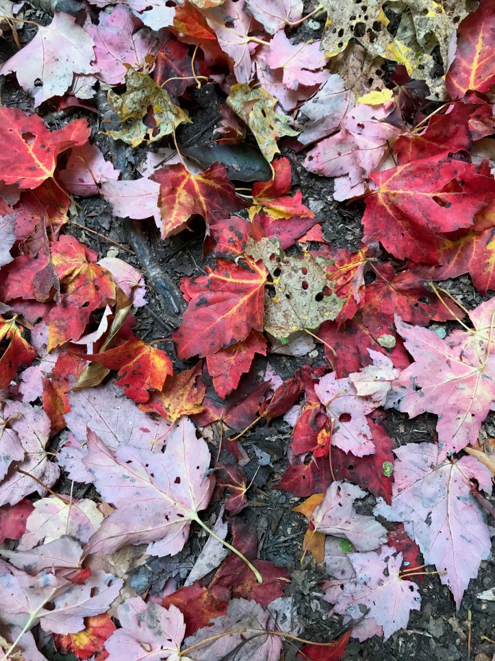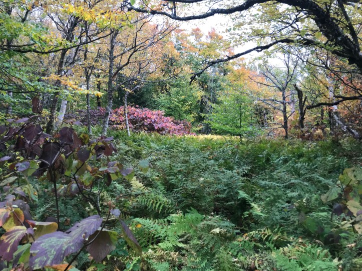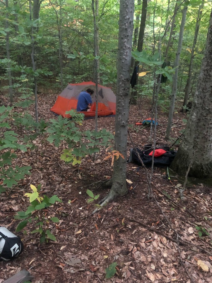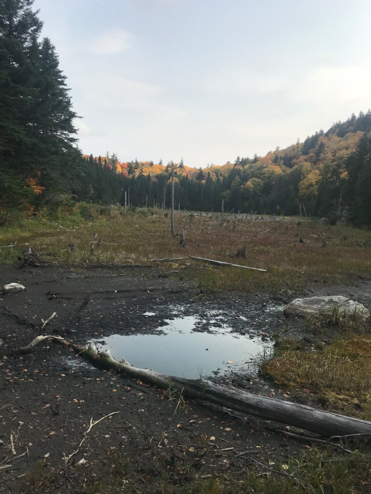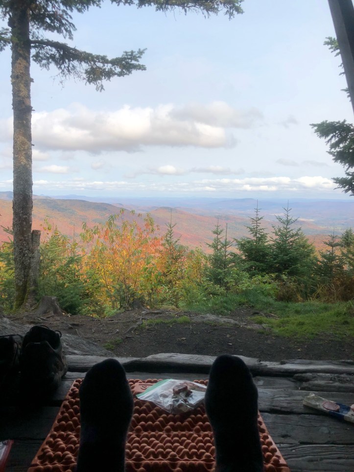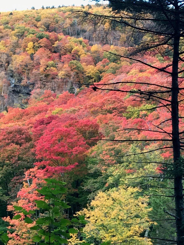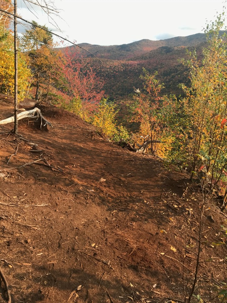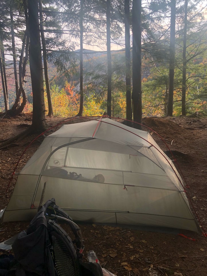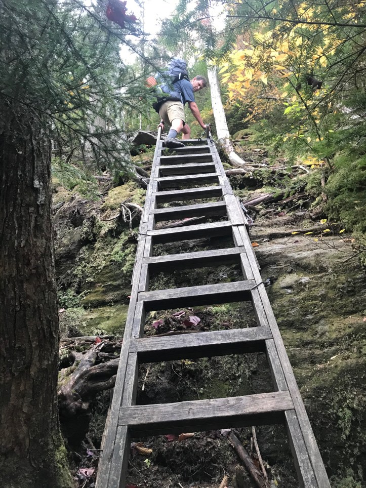 The descent to Taylor is what I referred to in ’18 as “roots and ladders” – the pics will refresh that image for you. We had intended to end up at Butler Lodge or, a bit lower on the mountain, Twin Brooks tenting area, but the water delay, combined with the knowledge that all we had to do was get up and over to Smugglers Notch for a rest day, had us staying put at Taylor for the night. Well, not Taylor exactly. A few college gals at the Lodge tipped us off to a site overlooking Nebraska Notch (thank you ladies!) that was just stunning amid all the color. I’m gonna play cute and not say exactly how to get there in case the three people reading this blog stampede up there and ruin it.
