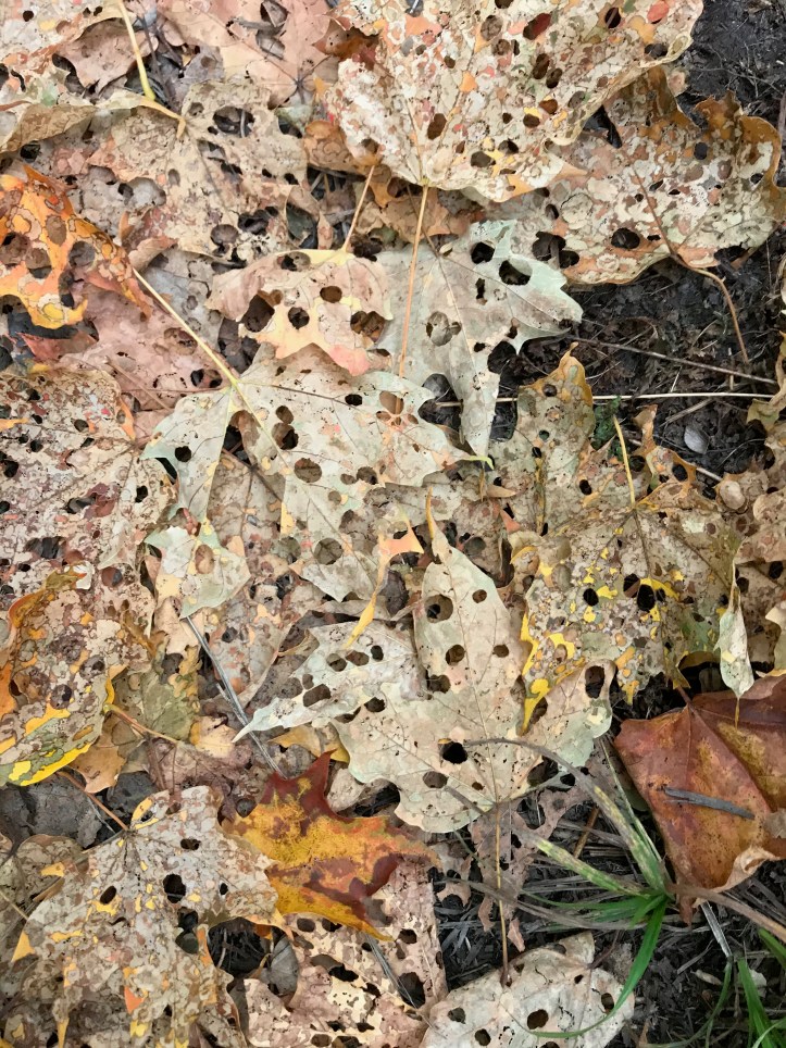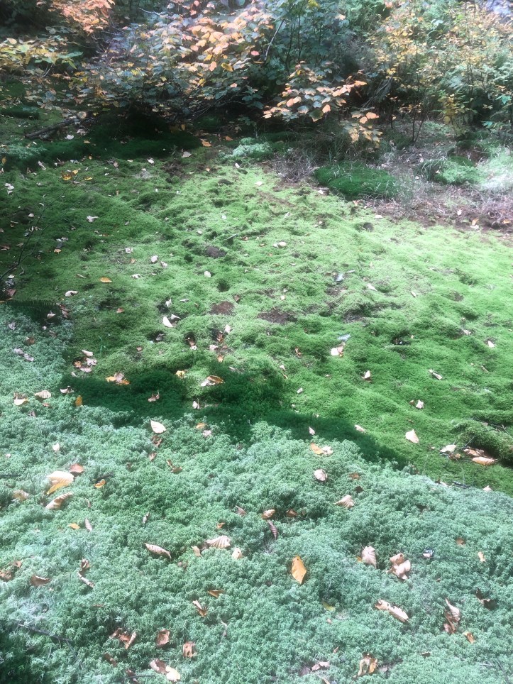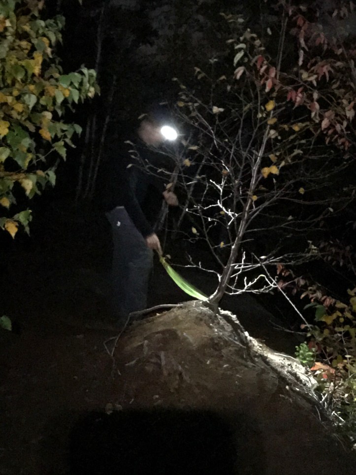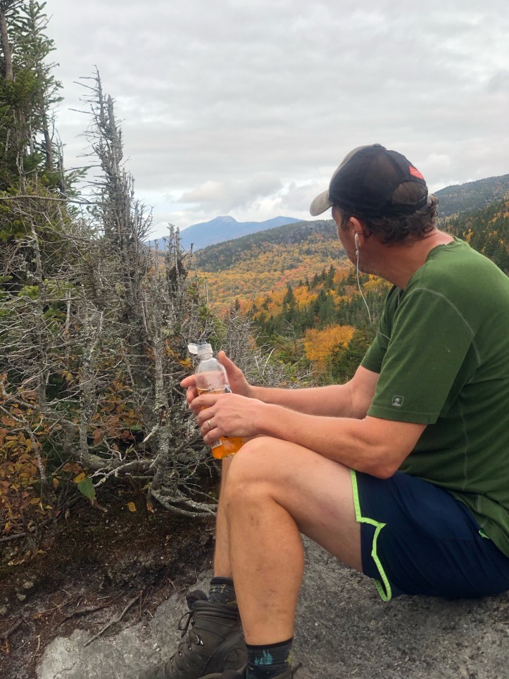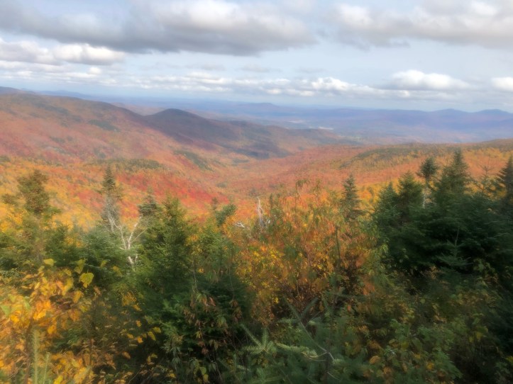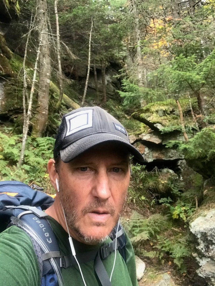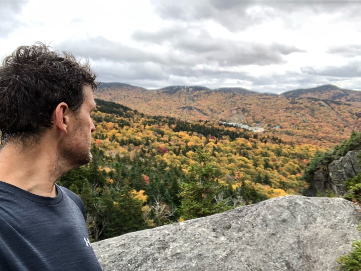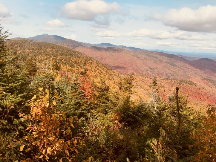 The final ascent up Bolton (my family’s “most hated” mountain as we hiked it a few years ago and got to the top of a bump before it and thought we were descending to the shelter), is one of those wet, rocky, mossy, dark passages that make you think of Lord of the Rings and such. When you are exhausted and the endorphins are coursing through your veins and you’ve been listening to voices in your head for hours, it probably would just plain make sense if Gollum slivered over a chunk of slimy granite muttering “my Precious.” So what a nice, contrasting payoff it was to get over the top and lunch at Puffer Shelter with its sunrise views east and the Old Man(sfield) looming in front of you. As you can see, pretty much peak foliage up here. Columbus Day leaf peepers will have been disappointed – color came early this year as the tress are stressed out from drought.