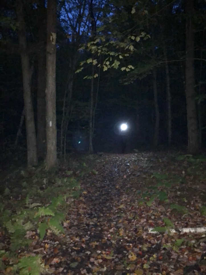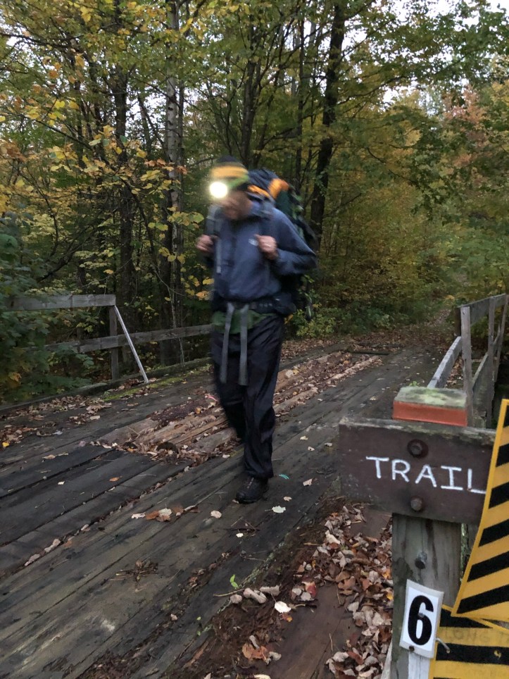 One of those days! 16 miles in solid rain, together with respectable vertical. Plan was to get off early, so we were packing up in the shelter before 6 – probably woke some folks up, but there was a party of 4 that had come in around 9:00 and wedged into the shelter on the floor and in assorted nooks and crannies, so a bit of payback to them and apologies to the rest! We hiked with headlamps until the trail turned to logging road, stopped to have breakfast, and of course it started raining at 7:00 and never stopped.